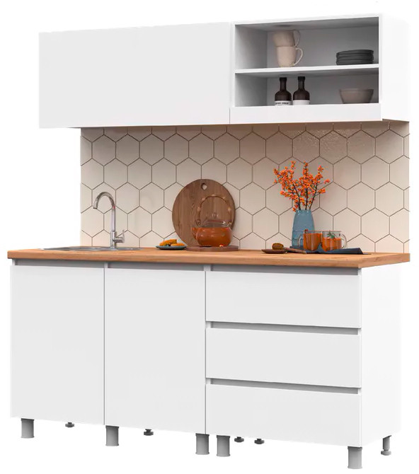 Готовое решение для организации интерьера предлагает кухня Хелен: обладая компактными габаритами, она гармонично впишется кухню любого размера. Она выполнена в скандинавском стиле с ровными фасадами без ручек, в сочетании теплых оттенков золотого дерева и белоснежных панелей, благодаря чему создает ощущение светлого уюта, чистоты и экологичности. Фасад обладает приятной на ощупь, шелковистой фактурой поверхности, которая не сохраняет отпечатков после касания. Каждый из модулей кухни Хелен обладает уникальным конструктивом и предлагает продуманный функционал, эргономично организовывая рабочее пространство, предоставляя достаточно места для хранения и размещения всех необходимых вещей, посуды и бытовой техники. Габаритный размеры нижних модулей ШхВхГ мм: 1700х820х600 мм. (С учетом высоты опор и столешницы). Габаритные размеры верхних модулей ШхВхГ мм: 1700х450х350 мм. Фасад: Декор ЛДСП, цвет Белый шагрень. Корпус: Декор ЛДСП, цвет Белый шагрень. Задняя стенка: ЛДВП, цвет Белый, 4 мм. Опоры: Регулируемые 100 мм., Декор Матовый хром. Столешница: ДСП 38 мм, раздельная 700 и 1000 мм, покрытая слоистым пластиком; Декор Дуб Вотан. Направляющие: Шариковые, полного выдвижения. Газлифт: Мебельный. Петли: Четырехшарнирные, накладные.