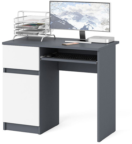 Стол компьютерный Мори МС-1 левый. Цвет - графит/белый. Габариты (ШхГхВ) 90х50х76,6 см. Аккуратный стол компьютерный с тумбой и выдвижной панелью для клавиатуры. Тумба имеет нишу с полочкой за распашной дверкой и выдвижной ящик на роликовых направляющих. Стол не имеет универсальной сборки - выдвижной ящик расположен слева.